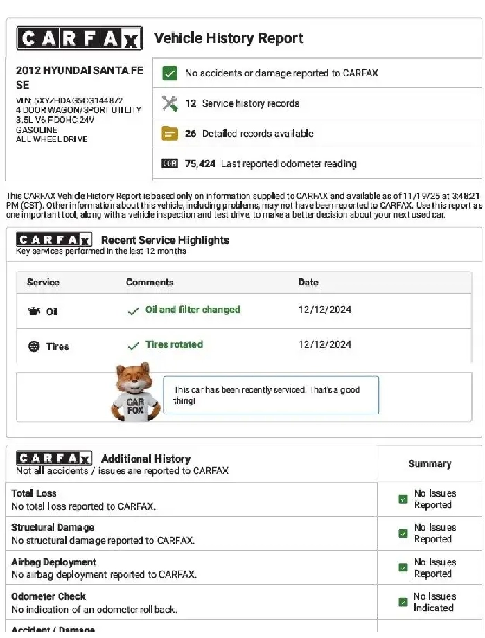 2012 Hyundai Santa Fe LIMITED AWD VERY CLEAN CONDITION DRIVE SMOOTH ECONOMY WITH THE GAS. Air conditioning Alloy wheels Bluetooth Cruise control Sunroof Trailer hitch Clean inside and out with leather seats. Runs and drives well, doesn’t need much for safety. Reliable SUV, great for family use or daily driving. All wheel-drive. As Is