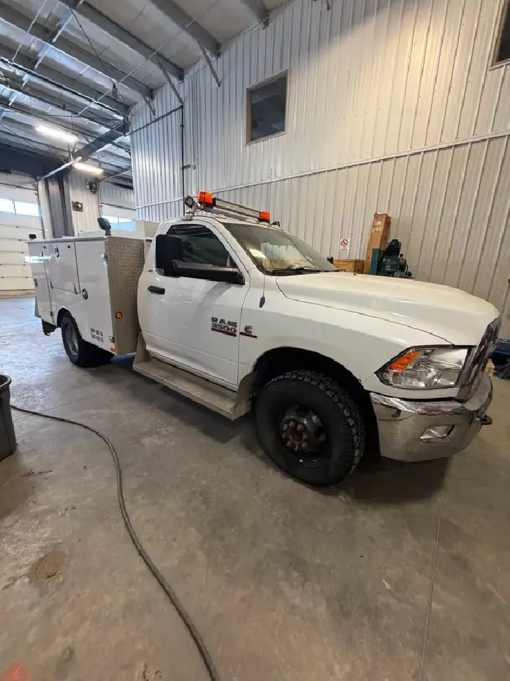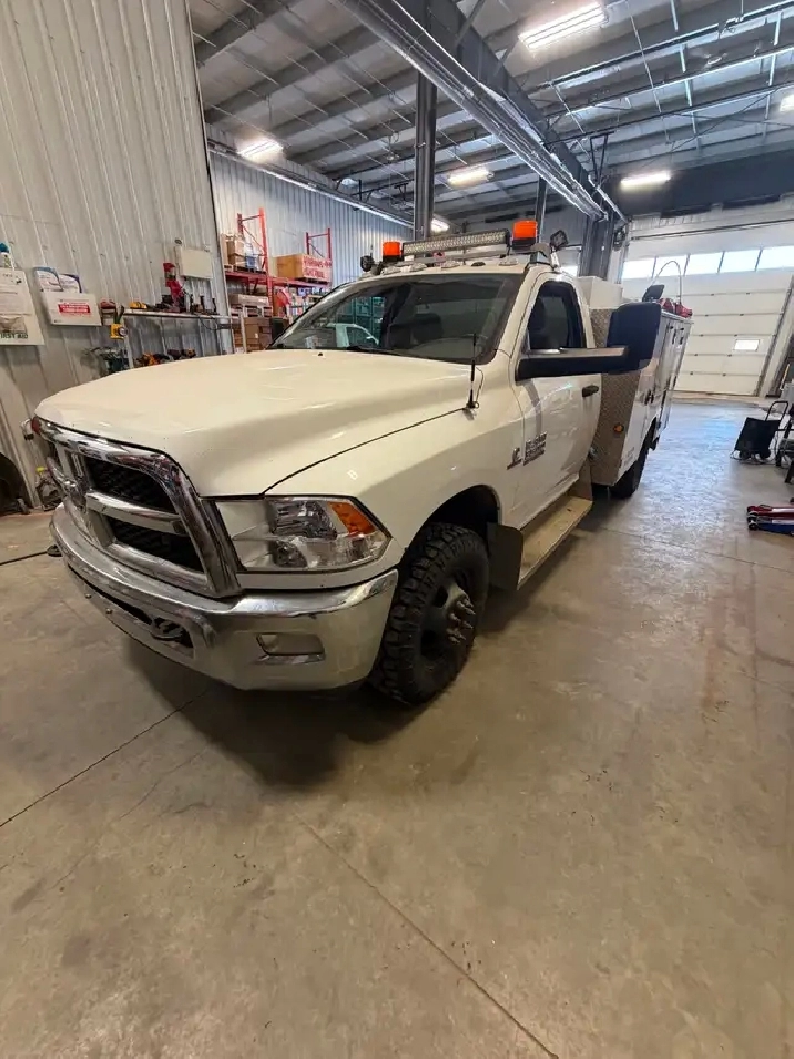2013 Ram 3500 Cummins Diesel service truck in good working condition. Set up with a heavy duty utility body and lots of lockable storage compartments – perfect for mechanics, oilfield, HVAC, electrical, or mobile service work.