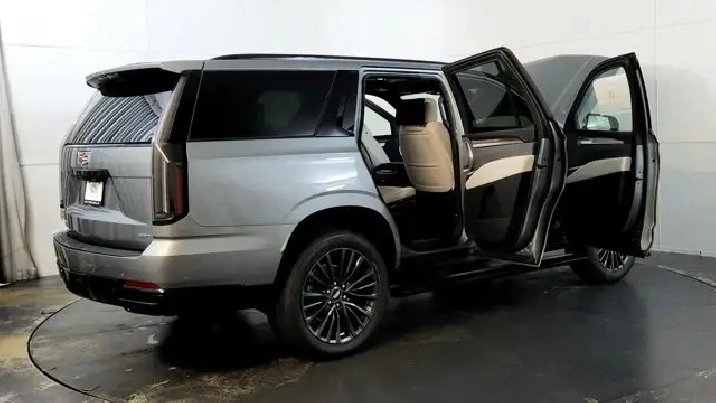 The 2026 Cadillac Escalade Platinum Sport 4WD pairs a potent 6.2-litre V8 engine with four-wheel drive and a 10-speed automatic transmission, delivering a commanding driving experience with up to 420 hp and 460 lb-ft of torque. Inside, it indulges occupants with full semi-aniline leather front seats with massage function, a panoramic sunroof, a sweeping 55-inch curved pillar-to-pillar display for the instrument cluster and infotainment, and an advanced 38-speaker AKG Studio Reference audio system. Safety and convenience features abound: active air-ride/adaptive suspension, power-opening and closing doors, Night Vision, a head-up display, and the latest driver-assist suite help this premium SUV combine luxury, tech and utility in one complete package.