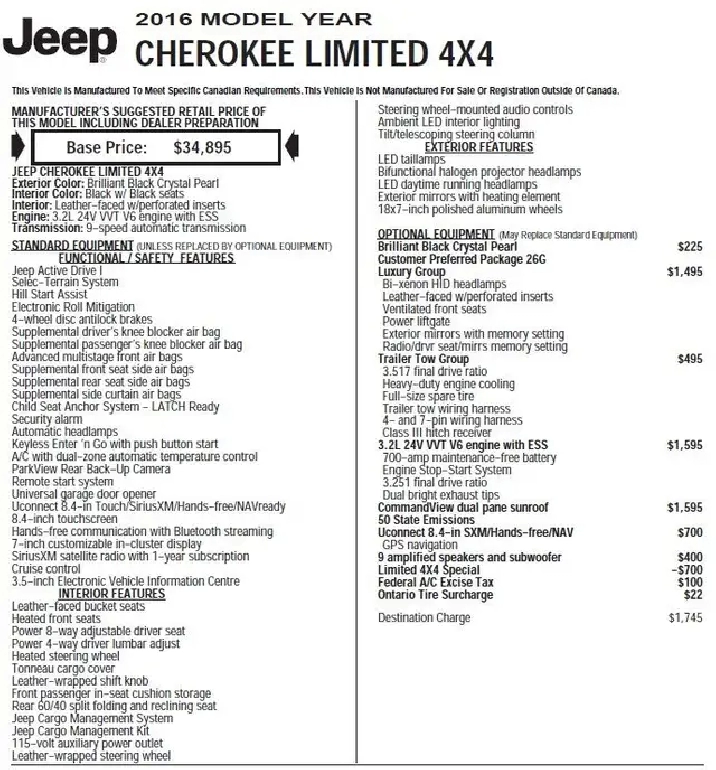 2016 Jeep Cherokee Limited 4X4 V6 - All Wheel Drive - Panoramic Sunroof - GPS - Power Tail Gate - Remote Start - Tow PKG - Cooled Leather - Finished in Brilliant Black Crystal Pearl.