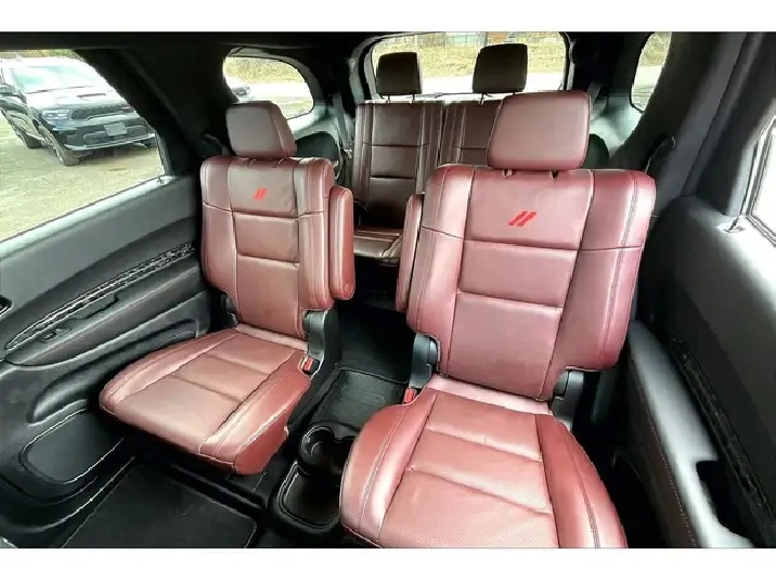 A rare mix of V8 muscle and premium SUV luxury, this 2024 Dodge Durango R/T Plus in DB Black with the Blacktop Package delivers the kind of presence and performance that sets it apart, powered by the 5.7L HEMI V8 producing 360 hp and 390 lb-ft of torque for strong, effortless acceleration and that unmistakable exhaust note. Inside, it feels properly upscale with heated and ventilated Nappa leather seats, a heated steering wheel, second-row captains chairs for true 6-passenger comfort, and a power sunroof paired with a Dinamica suede headliner and forged carbon fibre interior accents that give it a high-end, performance-inspired finish. The Uconnect 5 system on the 10.1-inch display with navigation, wireless Apple CarPlay and Android Auto, wireless charging, and a 19-speaker Harman Kardon audio system make every drive feel modern and immersive. Safety and driver assistance are fully covered with Adaptive Cruise Control, Lane Keep Assist, Forward Collision Warning, Blind Spot Monitoring, and parking sensors to make daily driving and long trips more relaxed. Finished with a power liftgate for added convenience and the aggressive Blacktop styling, this is the R/T Plus buyers look for, combining V8 power, premium features, and everyday practicality, and with One Owner, Clean Carfax history, it is a standout SUV that delivers on every level.