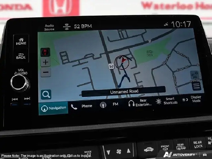 • Radio: AM/FM/HD Audio System -inc: HondaLink connected services, 9" touchscreen centre display w/navigation, 11 speakers including subwoofer, Speed-Sensitive Volume Control (SVC), SiriusXM, Apple CarPlay/Android Auto (wired/wireless), Bluetooth streaming audio, Wi-Fi hotspot capability, 1 front USB-A and 1 front USB-C SiriusXM only available in certain areas.