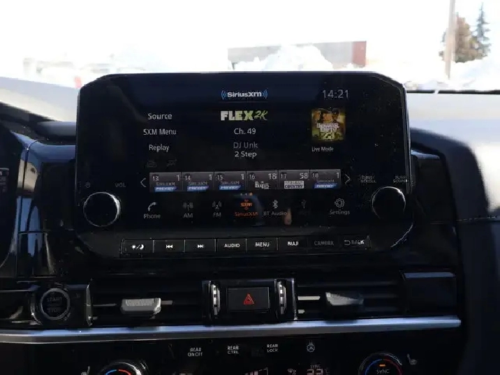 - Radio: AM/FM Audio System -inc: 6 speakers, NissanConnect featuring wireless Apple CarPlay and Android Auto, 9" colour display w/multi-touch control, SiriusXM satellite radio w/advanced audio features, 2 illuminated front USB connection ports (1 type A, 1 type C) for iPod interface and other compatible devices, Bluetooth hands-free phone system, streaming audio via Bluetooth, hands-free text messaging assistant, Siri Eyes-Free/Google Assistant voice recognition, over-the-air (OTA) updating for headunit firmware via Wi-Fi WPA2 connection and Nissan Door-to-Door navigation system w/3D building graphics, satellite imagery, 5 years complimentary map updates, connected navigation features including online, POI search, door-to-door navigation, online premium traffic information, SiriusXM Traffic, SiriusXM Travel Link, wireless charging pad and NissanConnect Services powered by SiriusXM w/trial access to 5-year select and 3 year premium packages