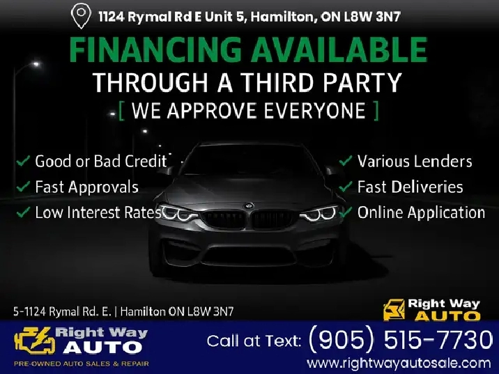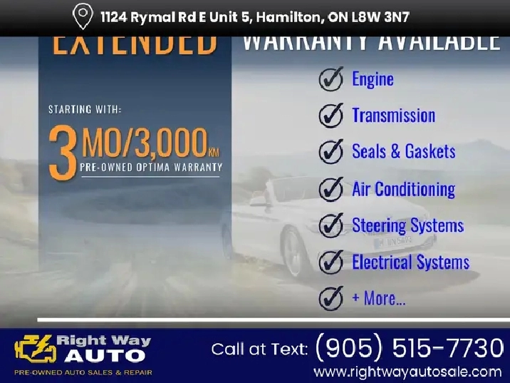 Various Extended WARRANTY packages available. Cash prices shown exclude HST & License Fees. Finance fees excluded unless applicable for all finance deals. Terms may vary and financing is subject to approval. Down payment may be required. Interest rates are subject to change. The financing rate is a preliminary calculation and is subject to verification. This rate is provided for informational purposes only and should not be considered as a final commitment. Financing is not available for vehicles over ten years old.