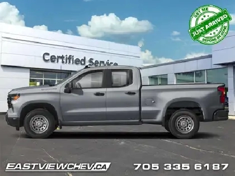 Trailering Package, Aluminum Wheels, Remote Start, Automatic Emergency Braking, Lane Keep Assist! This 2025 Silverado 1500 is engineered for ultra-premium comfort, offering high-tech upgrades, beautiful styling, authentic materials and thoughtfully crafted details. This 2025 Chevrolet Silverado 1500 stands out in the midsize pickup truck segment, with bold proportions that create a commanding stance on and off road. Next level comfort and technology is paired with its outstanding performance and capability. Inside, the Silverado 1500 supports you through rough terrain with expertly designed seats and robust suspension. This amazing 2025 Silverado 1500 is ready for whatever. This Sterling Grey Metallic Extended Cab 4X4 pickup has an Automatic transmission and is powered by a 310HP 2.7L 4 Cylinder Engine. Our Silverado 1500's trim level is Custom. Standard features include a trailering package, remote start, aluminum wheels, hitch guidance, a power locking EZ lift tailgate, and a 7-inch infotainment display with Apple CarPlay and Android Auto. Safety features also include lane keep assist with lane departure warning, following distance indication, forward collision alert, and automatic emergency braking with front pedestrian braking. This vehicle has been upgraded with the following features: Trailering Package, Aluminum Wheels, Remote Start, Automatic Emergency Braking, Lane Keep Assist, Lane Departure Warning, Forward Collision Alert. To apply right now for financing use this link: https://www.eastviewchev.ca/FinancePreQualForm 0% financing for 36 months. 3.99% financing for 84 months. Buy this vehicle now for the lowest bi-weekly payment of $409.72 with $0 down for 84 months @ 3.99% APR O.A.C. (Complete pricing and payments may differ than advertised, depending on model, trim and options. ). Incentives expire 2026-04-30. See dealer for details. Includes: Environmental fees ($1.00) OMVIC Fee ($10.00) Tire Stewardship ($29.20).(HST), license & registration not included.Eastview Chevrolet is dedicated to making sure your experience is exciting, fun and enjoyable. We are located at 222 Government Rd. in Kapuskasing. We have hundreds of vehicle to choose from and will go out of our way to find you exactly what you are looking for. Call one of our professional staff to arrange your next test drive in a New Chevrolet, Buick or GMC vehicles. Call 705-335-6187. o~o