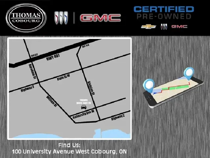 WE DELIVER ANYWHERE IN ONTARIO, ASK US FOR DETAILS, DELIVERY FEES MAY APPLY! WE OFFER FINANCING! * For more info and availability please call or EMAIL Thomas Buick GMC today! When you buy a Certified Pre-Owned Vehicle at Thomas Buick GMC in Cobourg, you'll get standard features you won't find anywhere else, like a manufacturer's backed warranty, a 150 point inspection of the vehicle, an exchange privilege and 24-hour roadside assistance. When you think about it, buying a Certified Pre-Owned Vehicle just makes sense. Prices include all fees except HST and license. PLEASE NOTE: Fee specifications and availability are subject to change without notice. Contact dealer for most current information