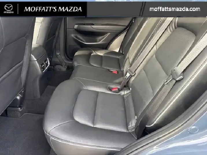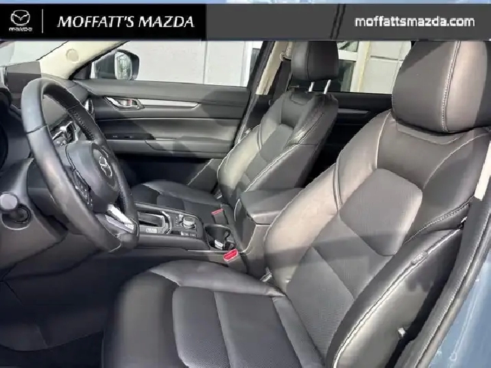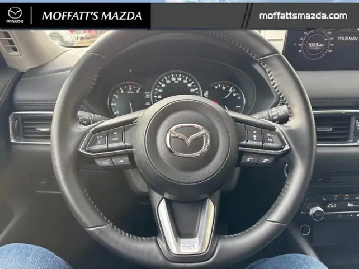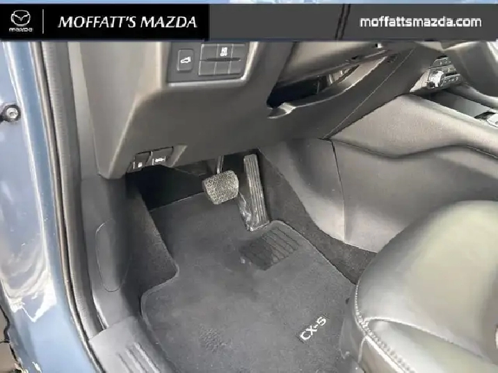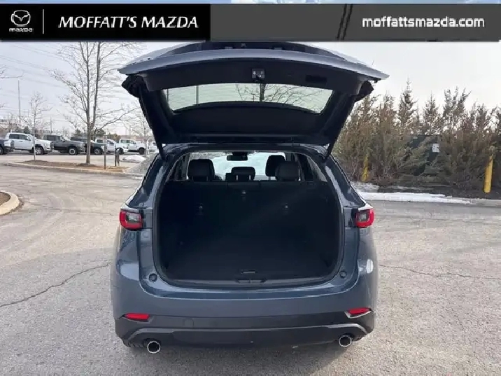 Our CX-5's trim level is GS. Standard features include a power liftgate for rear cargo access, heated front seats with a heated steering wheel, dual-zone climate control, adaptive cruise control, smart device remote engine start, automatic high beams, and a 10.25-inch infotainment screen with Apple CarPlay and Android Auto. Safety features also include lane keep assist with lane departure warning, collision mitigation, and advanced bins spot monitoring.