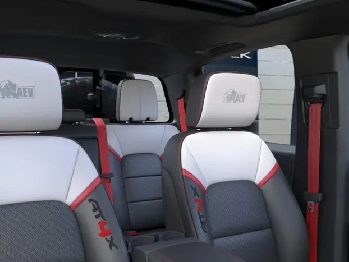 • AT4X includes (Z82) Trailering Package, (3F9) Red seatbelt colour, (AAK) All-weather floor mats, LPO, (BZT) Off-Road Rocker Protection, (CGN) Spray-on bedliner, (G93) electronic, driver-selectable full-locking front differential, (G94) electronic, driver-selectable full-locking rear differential, (HS1) Safety Alert Seat, (HV1) Obsidian Rush interior trim, (MFI) sport upper body window mouldings, (QAF) LT285/70R17C MT blackwall tires, (R34) 17" Black High Gloss Machined Finish Aluminum wheels, (RMR) spare LT285/70R17C MT blackwall tire, (U1D) In-vehicle Trailering App, (UXA) underbody cameras, Drive mode selector adds Baja mode, (AGG) solar glazing front side glass and Off-Road Suspension with 3" lift.