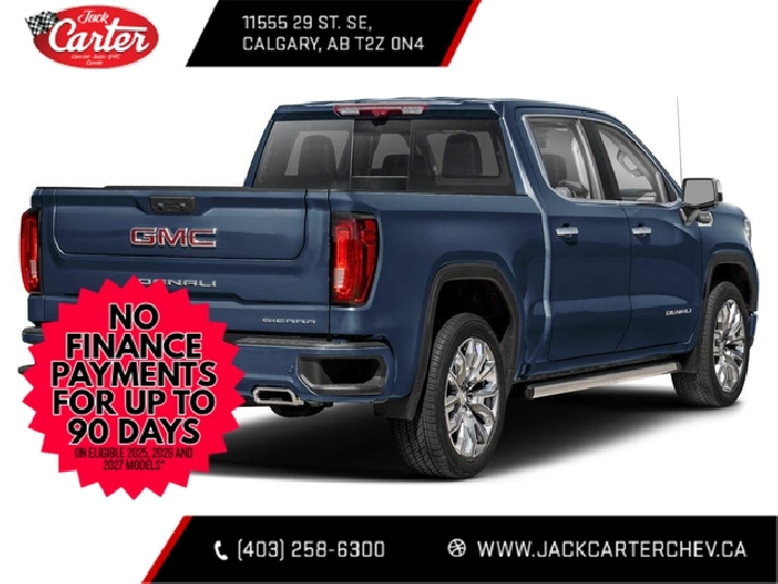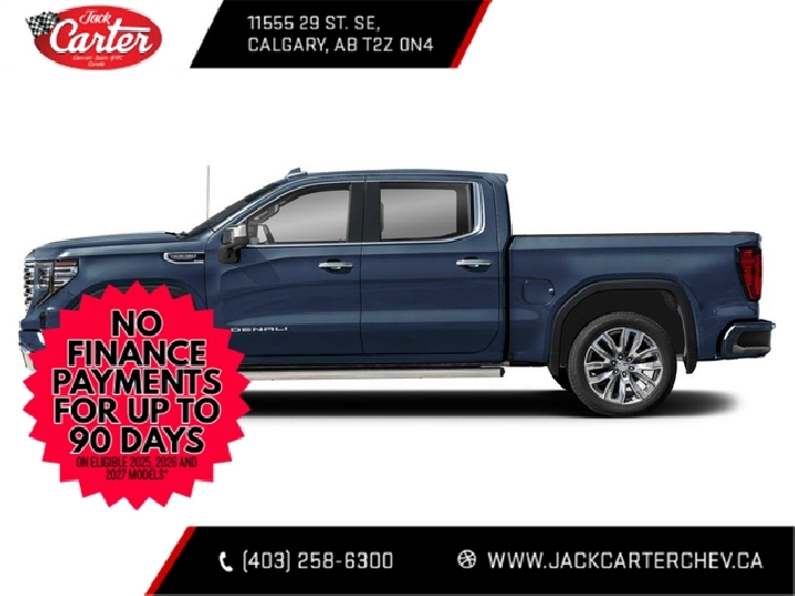 Looking for your best deal on a new Sierra in Calgary? Then try shopping with us: Jack Carters Chevrolet Buick GMC. Located in SE Calgary with easy access off the Deerfoot and Douglasdale, we’ve been giving Calgary and surrounding area the best deal and the best service since 1962. Our Sales staff is experienced and friendly making your truck purchase easy and straightforward. No games, no gimmicks, no marked up GM MSRPs like our competitors do, just great advice and low prices from the start. True GM window stickers on diplay on our lot and in our showroom. Call us for a consult today 403-258-6300Choose your Model, flexibility of short box, standard box or long box. Choose your Cab fro Reg cab, Double cab and crew cab. Choose your engine from the 6.2L V8 that delivers best-in-class V8 power and towing, an available LZ0 Duramax® 3.0L Turbo-Diesel that offers better fuel efficiency than any other full-size pickup, the legendary 5.3L V8, and GM’s new Turbo 2.7L option producing the same torque as the 6.2L V8. Choose your trim from the everything you need Pro, the new tried and tested SLE and the SLT, sporty Elevation, the top of the line Denali and Denali Ultimate, or go with our factory lifted lineup: the At4, or the overcome anything AT4X. Choose Jack Carter and give our friendly sale staff a call at 403-258-6300 or visit us at jackcarterchev.com. Key Available features: 4X4 / Four Wheel Drive, G80 Locking Differential, Z71 Off Road Suspension, X31 off Road package, Front Bucket seats, Leather seats, Power passenger seat, memory seats, Max Trailer Package, NHT, Bose sound system, Power sliding rear window, Remote start, heated seats, heated steering wheel, cooled seats, Front park assist, rear parking assist, Surround vision camera, Wireless charging, Adaptive cruise control, Supercruise, Carbon Fiber Bed, Premium Suspension with adaptive ride control, XM radio, Apple Carplay and Android Auto, Massage seats, rear camera mirror and more.