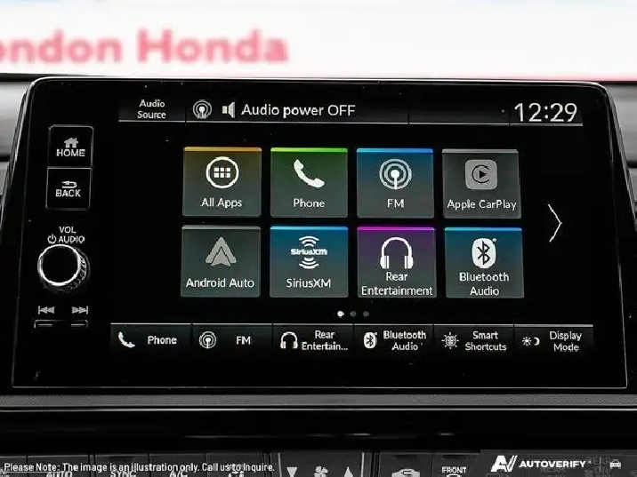 - Radio: AM/FM/HD Audio System -inc: HondaLink connected services, 9" touchscreen centre display, 7 speakers including subwoofer, Speed-Sensitive Volume Control (SVC), SiriusXM, Apple CarPlay/Android Auto (wired/wireless), Bluetooth streaming audio, Wi-Fi hotspot capability, 1 front USB-A and 1 front USB-C SiriusXM only available in certain areas.