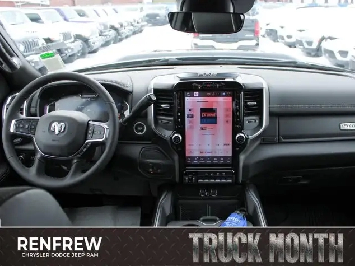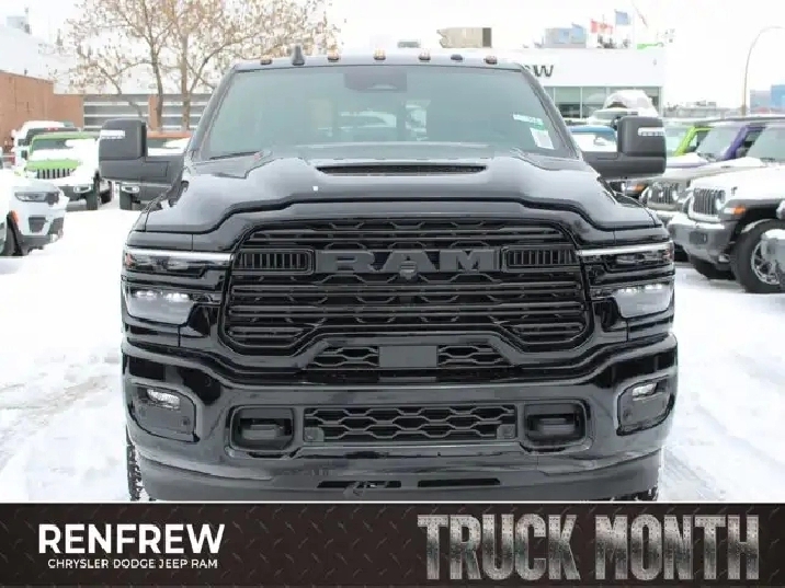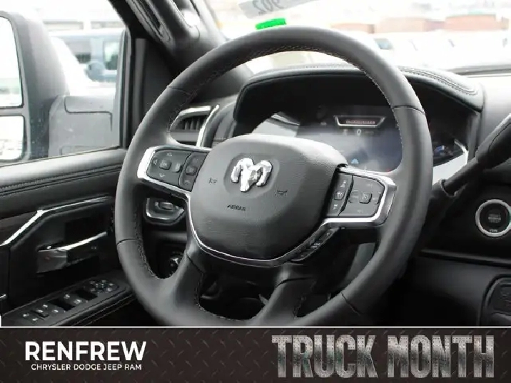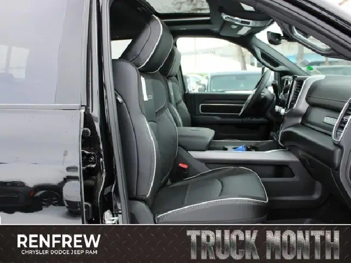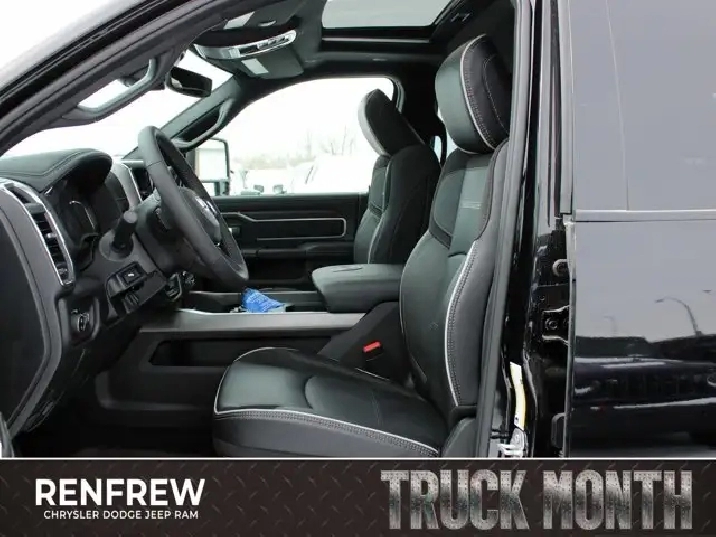 • TIRES: LT285/60R20E OWL ON/OFF-ROAD,POWER SUNROOF,IP-MOUNTED AUXILIARY SWITCHES -inc: Dash Pass Thru Wire Circuits,QUICK ORDER PACKAGE 24H -inc: Engine: 6.7L Cummins I-6 HO Turbo Diesel Transmission: 8-Speed TorqueFlite Automatic,BLACK LEATHER-FACED BUCKET SEATS -inc: Bucket Seats Dual Wireless Charging Pad Front Ventilated Seats Radio/Driver Seat/Mirrors/Pedals Memory Full-Length Upgraded Floor Console,TRANSMISSION: 8-SPEED TORQUEFLITE AUTOMATIC -inc: 12 Single-Wheel Rear Axle,WHEELS: 20 X 8 BLACK ALUMINUM,CLEARANCE LAMPS,GVWR: 5 352 KG (11 800 LBS),LARAMIE LEVEL 1 PLUS EQUIPMENT GROUP -inc: Centre Stop Lamp w/Cargo Camera Rain-Sensing Windshield Wipers Power Adjustable Pedals w/Memory LED Bed Lighting Traffic Sign Recognition Adaptive Steering System Auto-Dimming Exterior Driver Mirror Drowsy Driver Detection MOPAR Deployable Bed Step Door Trim Panel Foam Bottle Insert Active Lane Management System Power Heated Folding Telescope Chrome Mirror MOPAR Spray-In Bedliner Remote Tailgate Release Automatic High-Beam Headlamp Control Exterior Mirrors w/Memory Settings Second Row In-Floor Storage Bins Auto Dimming Exterior Passenger Mirror Auto Adjust In Reverse Exterior Mirrors,DIAMOND BLACK CRYSTAL PEARL,5TH WHEEL/GOOSENECK TOWING PREP GROUP,ENGINE: 6.7L CUMMINS I-6 HO TURBO DIESEL -inc: Selective Catalytic Reduction (Urea) Dual 730-Amp Maintenance-Free Batteries Cummins Turbo Diesel Badge Heavy-Duty Engine Cooling Supplemental Heater 3.42 Axle Ratio MOPAR Winter Front Grille Cover GVWR: 5 352 kg (11 800 lbs) Current Generation Engine Controller Diesel Exhaust Brake Front Bumper Sight Shields Capless Fuel-Filler,NIGHT EDITION -inc: Tires: LT285/60R20E OWL On/Off-Road Black Exterior Badging Wheels: 20 x 8 Black Aluminum Grille w/Gloss Black Billets & Accents Body-Colour Grille Surround Sport Performance Hood,CENTRE STOP LAMP W/CARGO CAMERA,3.42 AXLE RATIO,Tow Hitch,Four Wheel Drive,Heated Mirrors,Power Mirror(s),Brake Assist,Intermittent Wipers,Power Door Locks,Tow Hooks,LED Headlights,Aluminum Wheels,4-Wheel Disc Brakes,ABS,Locking/Limited Slip Differential,Conventional Spare Tire,Variable Speed Intermittent Wipers,Integrated Turn Signal Mirrors,Fog Lamps,Power Folding Mirrors,Power Steering,Automatic Headlights,Daytime Running Lights,Rear Defrost,Privacy Glass,Requires Subscription,Satellite Radio,Steering Wheel Audio Controls,HD Radio,Requires Subscription,Satellite Radio,Premium Sound System,Requires Subscription,Power Door Locks,Premium Sound System,Bluetooth Connection,Auxiliary Audio Input,MP3 Capability,HD Radio,Navigation System,Satellite Radio,AM/FM Stereo,Keyless Entry,Multi-Zone A/C,Universal Garage Door Opener,Adaptive Cruise Control,Cruise Control,Keyless Start,Heated Steering Wheel,Climate Control,Power Passenger Seat,Driver Adjustable Lumbar,Power Windows,Keyless Entry,Remote Engine Start,Power Door Locks,Rear Bench Seat,Trip Computer,Power Driver Seat,Adjustable Steering Wheel,A/C,Pass-Through Rear Seat,Child Safety Locks,Back-Up Camera,Passenger Air Bag Sensor,Front Side Air Bag,Front Head Air Bag,Tire Pressure Monitor,Rear Parking Aid,Smart Device Integration,Keyless Start,Woodgrain Interior Trim,Passenger Vanity Mirror,Passenger Illuminated Visor Mirror,Leather Seats,Front Collision Mitigation,Power Door Locks,Power Windows,Split Bench Seat,Rear Head Air Bag,Passenger Air Bag,Traction Control,Immobilizer,Floor Mats,Premium Synthetic Seats,Passenger Adjustable Lumbar,Security System,Smart Device Integration,Stability Control,Smart Device Integration,Driver Air Bag,Bluetooth Connection,Blind Spot Monitor,Driver Vanity Mirror,Auto-Dimming Rearview Mirror,Remote Engine Start,Heated Front Seat(s),Cross-Traffic Alert,Driver Illuminated Vanity Mirror,Trip Computer,Navigation System,Traction Control,WiFi Hotspot,Requires Subscription
