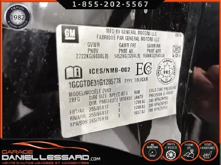 4X4 CREW CAB, Z71 TRAIL, V6 3.6L, BAS KILO, CUIR, GPS, CAM ET SONARS RECUL, MAGS 17P, XM REPRIS EN ÉCHANGE, VENDU ICI MÊME EN 2018, MODÈLE Z-71 CREW CAB V-6 4WD, TRÈS BIEN ÉQUIPÉ, ACCIDENTÉ ET RÉPARÉ DANS LE PASSÉ AVEC MENTION RECONSTRUIT ( VOIR LES 4 DERNIÈRES PHOTOS AVANT RÉPARATION ) INSPECTÉ AU COMPLET, FREIN AVANT ET ARRIERE NEUF, FILTRE A AIR ET HABILACLE NEUF, CHANGEMENT D'HUILE, ENTRETIEN A JOURS, GARANTIE DE 1 MOIS OU 1700 KM, FINANCEMENT DISPONIBLE ICI MÊME, PLUS DE DÉTAILS ET PHOTOS AU WWW.DANIELLESSARD.COM **** IMPERFECTION AU COIN DE PARE CHOC ARRIERE DROIT ET LES COTÉ DE BOITE SONT BLANCHIE LEGEREMENT VOIR IMAGES *** CHEVROLET COLORADO AVEC GROUPE Z-71 2016 CREW CAB AVEC BOITE DE 6.2 PIED AVEC FOND EN ENDUIT PULVÉRISÉ! CAMION AVEC BAS KM, MOTEUR V6 3.6 LITRES DE 305HP@ 6800TR/M ET 269LBS @ 4000TR/M, TRANSMISSION AUTOMATIQUE 6 VITESSES AVEC MODE TOW-HAUL, LA CONSOMMATION D'ESSENCE VARIE ENTRE 8,7 @ 13,5 L AU 100 KM, IL POSSÈDE LES CONTRÔLES DE BOÎTE DE TRANSFERT ÉLECTRIQUE AVEC FONCTION 2X4-4X4 HI- 4X4 LO ET MODE AUTO, GROUPE ÉLECTRIQUE COMPLET DE SÉRIE AVEC VITRE ARRIÈRE COULISSANTE, INTÉRIEUR EN CUIR ET TISSUS DE COULEUR CHARBON AVEC BANC AVANT CHAUFFANT 2 MODE (FESSIER ET DOSSIER CHAUFFANT OU DOSSIER CHAUFFANT SEULEMENT), CLIMATISATION AUTOMATIQUE, CRUISE CONTROL, CONTRÔLE AUDIO ET CONTRÔLE TÉLÉPHONIQUE BLUETOOTH AU VOLANT, ANTI-PATINAGE, ORDINATEUR DE BORD, CAMÉRA DE RECUL, RADIO HAUT DE GAMME BOSE AVEC AM FM SIRIUS XM, SORTIE AUXILIAIRE ET MULTIPLES SORTIES USB, SYSTÈME DE NAVIGATION GPS, MARCHE-PIED LATÉRAL OFF ROAD NOIR, GROUPE REMORQUAGE COMPLET 2 POUCES, ENDUIT DE CAOUTCHOUC À L'INTÉRIEUR DE LA BOÎTE, RACK EN TUBE NOIR POUR BOITE AVEC LUMIÈRE, MAGS D'ORIGINE AVEC PNEUS GOODYEAR WRANGLER DURATRAC HOMOLOGUÉ 265 / 65 / 17 AVEC 40% D'USURE, NOUS AVONS LES 2 CLEFS AVEC 2 MANETTES INCLUANT LE DÉMARREUR, LES TAPIS DE CAOUTCHOUC Z-71 DE COMPAGNIE ET LA LOCK NUT, CONTACTEZ L’UN DE NOS CONSEILLERS QUALIFIÉS POUR PLUS DE DÉTAILS ! PLUSIEURS VÉHICULES DE TOUTES MARQUES DISPONIBLES AU WWW.DANIELLESSARD.COM, LA PLACE POUR MAGASINER VOTRE VÉHICULE JAMAIS ACCIDENTÉ, RÉPARÉ OU ENDOMMAGÉ. PLUS DE 200 VÉHICULES DISPONIBLES, NOUVEAUX ARRIVAGES QUOTIDIENS !!! NOUS ACCEPTONS ÉGALEMENT VOTRE ÉCHANGE. LES CLIENT QUI AURONT PRIS RENDEZ-VOUS SERONT PRIORISÉ LORS DE LEUR VENU SUR PLACE. NOS VÉHICULES PRÊTS À PARTIR SONT INSPECTÉS AU COMPLET PAR NOUS ET LA SAAQ, VENDUS AVEC GARANTIE. NOUS SOMMES OUVERTS DU LUNDI AU VENDREDI 8:00 À 17:00 ET LE SAMEDI AU 9:00 À 12:00. VISITEZ NOTRE PAGE FACEBOOK ! AU PLAISIR DE VOUS RENCONTRER. À VOTRE SERVICE DEPUIS 1982 TRADE-IN, SOLD HERE IN 2018, Z-71 CREW CAB V-6 4WD, VERY WELL EQUIPPED, PAST ACCIDENTED AND REPAIRED WITH REBUILT CREDIT (SEE THE LAST 4 PHOTOS BEFORE REPAIR), FULLY INSPECTED, 1 MONTH OR 1700 KM WARRANTY, FINANCING AVAILABLE HERE, MORE DETAILS AND PHOTOS AT WWW.DANIELLESSARD.COM ................................................................................................................................................................................................................................................................................... 2016 CHEVROLET COLORADO WITH Z-71, CREW CAB WITH 6.2-FOOT BOX AND SPRAY-COATED FLOOR! TRUCK WITH LOW MILEAGE, 3.6-LITER V6 ENGINE 305HP@6800RPM AND 269LB @4000RPM, 6-SPEED AUTOMATIC TRANSMISSION WITH TOW-HAUL MODE, FUEL CONSUMPTION VARIES BETWEEN 8.7 AND 13.5 L/100 KM, IT HAS ELECTRIC TRANSFER CASE CONTROLS WITH 2WD-4WD-4WD HI-4WD-LO AND AUTO MODE, STANDARD FULL POWER GROUP WITH SLIDING REAR WINDOW, CHARCOAL-COLORED LEATHER AND FABRIC INTERIOR WITH 2-MOTION HEATED FRONT SEATS (HEATED BUTTERFLY AND BACKREST OR HEATED BACKREST ONLY), AUTOMATIC CLIMATE CONTROL, CRUISE CONTROL, AUDIO CONTROL AND BLUETOOTH PHONE CONTROLS ON THE STEERING WHEEL, TRACTION CONTROL, ON-BOARD COMPUTER, REARVIEW CAMERA, PREMIUM BOSE RADIO WITH AM/FM SIRIUS XM, AUXILIARY OUTLET AND MULTIPLE USB OUTLETS, GPS NAVIGATION SYSTEM, BLACK OFF-ROAD SIDE STEPS, COMPLETE 2-INCH TOWING PACKAGE, RUBBER LINER INSIDE THE BOX, BLACK TUBE BOX RACK WITH LIGHT, ORIGINAL RIMS WITH APPROVED GOODYEAR WRANGLER DURATRAC TIRES 265/65/17 WITH 40% WEAR, WE HAVE BOTH KEYS WITH BOTH RELEASE KEYS INCLUDING THE STARTER, THE Z-71 RUBBER FLOOR MATS COMPANY AND THE LOCK NUT, ................................................................................................................................................................................................................................................................................... CONTACT ONE OF OUR QUALIFIED ADVISORS FOR MORE DETAILS! SEVERAL VEHICLES OF ALL MAKES AVAILABLE AT WWW.DANIELLESSARD.COM, THE PLACE TO SHOP FOR YOUR VEHICLE THAT HAS NEVER BEEN IN AN ACCIDENT, REPAIRED, OR DAMAGED. OVER 200 VEHICLES AVAILABLE, NEW ARRIVALS DAILY!!! WE ALSO ACCEPT TRADE-INS. CUSTOMERS WHO HAVE MADE AN APPOINTMENT WILL BE GIVEN PRIORITY UPON THEIR ARRIVAL. OUR READY-TO-GO VEHICLES ARE FULLY INSPECTED BY US AND THE SAAQ, AND SOLD WITH A WARRANTY. We are open Monday to Friday from 8:00 AM to 5:00 PM and Saturday from 9:00 AM to 12:00 PM. Visit our Facebook page! We look forward to meeting you. At your service since 1982.