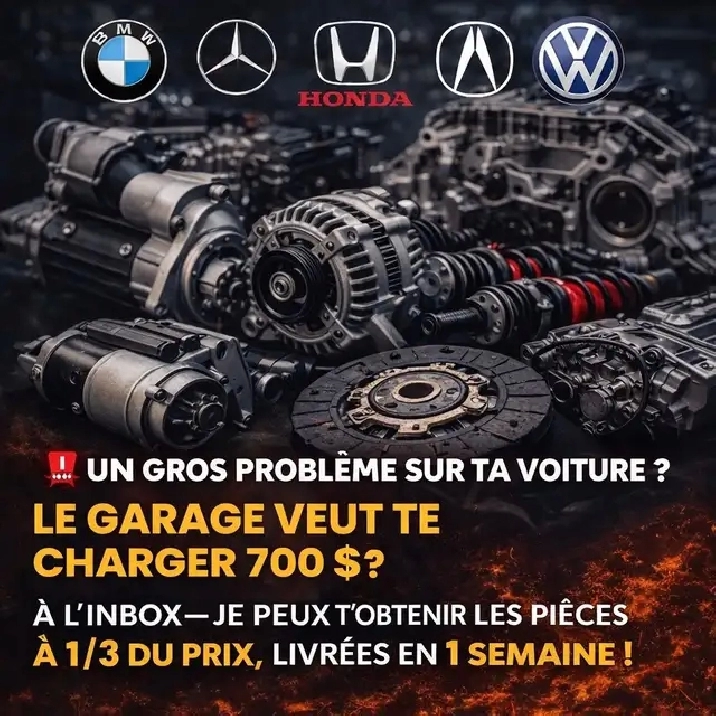 Vous êtes tanné de payer le gris prix pour vos pièces d’auto!!??? Je vous livre ça en 7 jours maximum partout au Canada et 2-3 jours au Québec maximum FAITE LE TEST ÉCRIRE EN PV POUR UNE SOUMISSION! 819-410-1105 L’ESSAYER CE L’ADOPTÉ!!! De 2@4 fois MOIN CHER !!!
